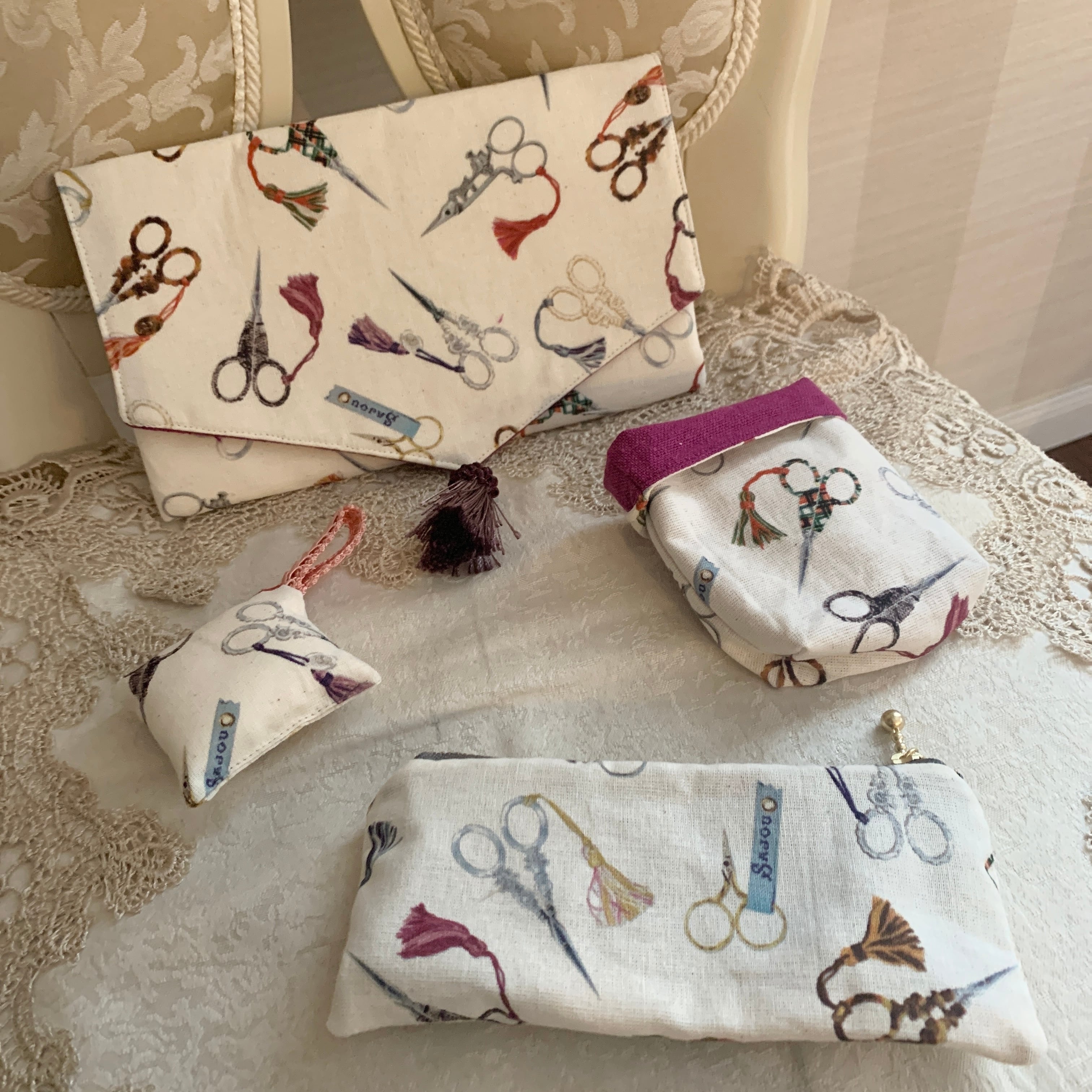 ※SAJOUのハサミ柄ファブリック(写真2枚目)で作ったミニポーチ、袱紗、針山のようなおまけをランダムに同封します^^