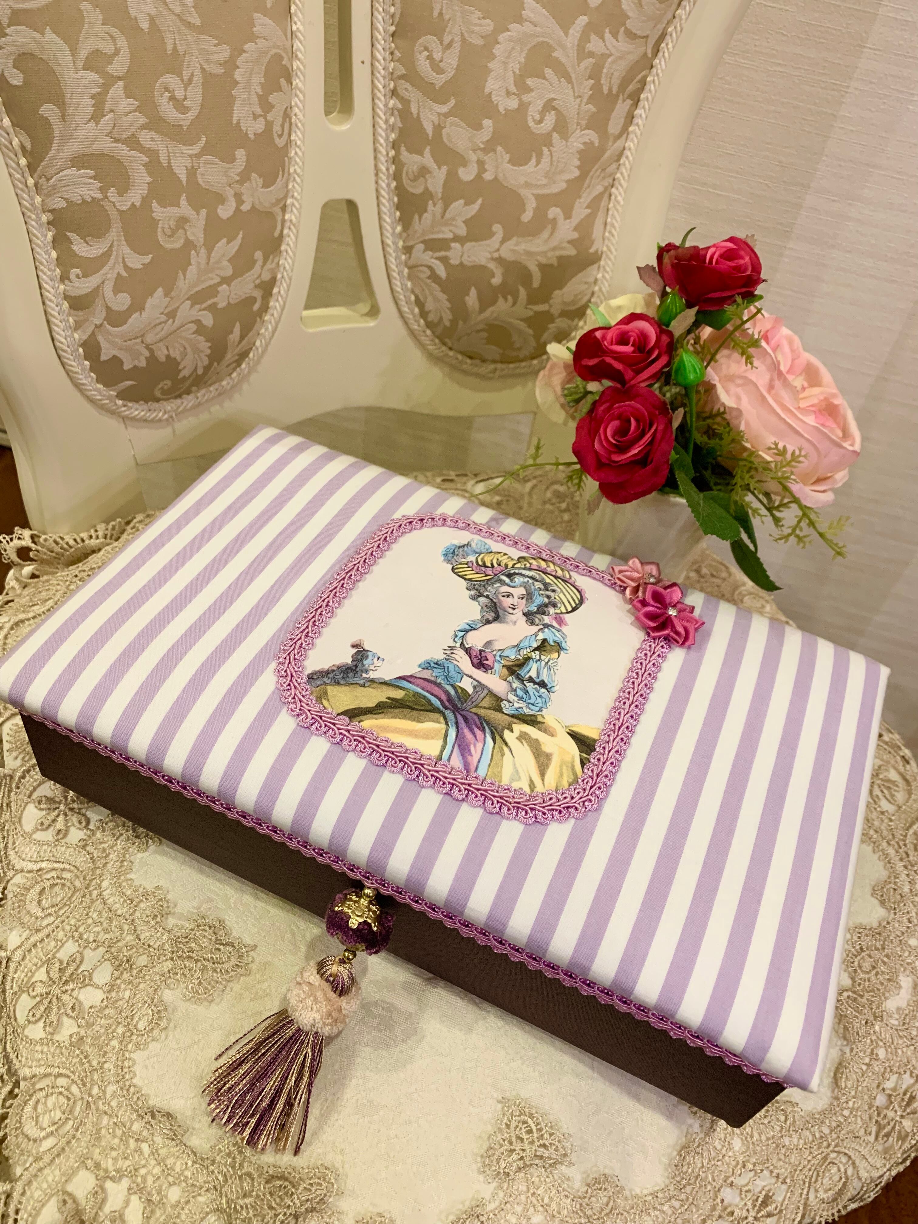 ヴィクトリアン調の貴婦人の背景にストライプ生地と組み合わせ、ブレードに薔薇をあしらいました。