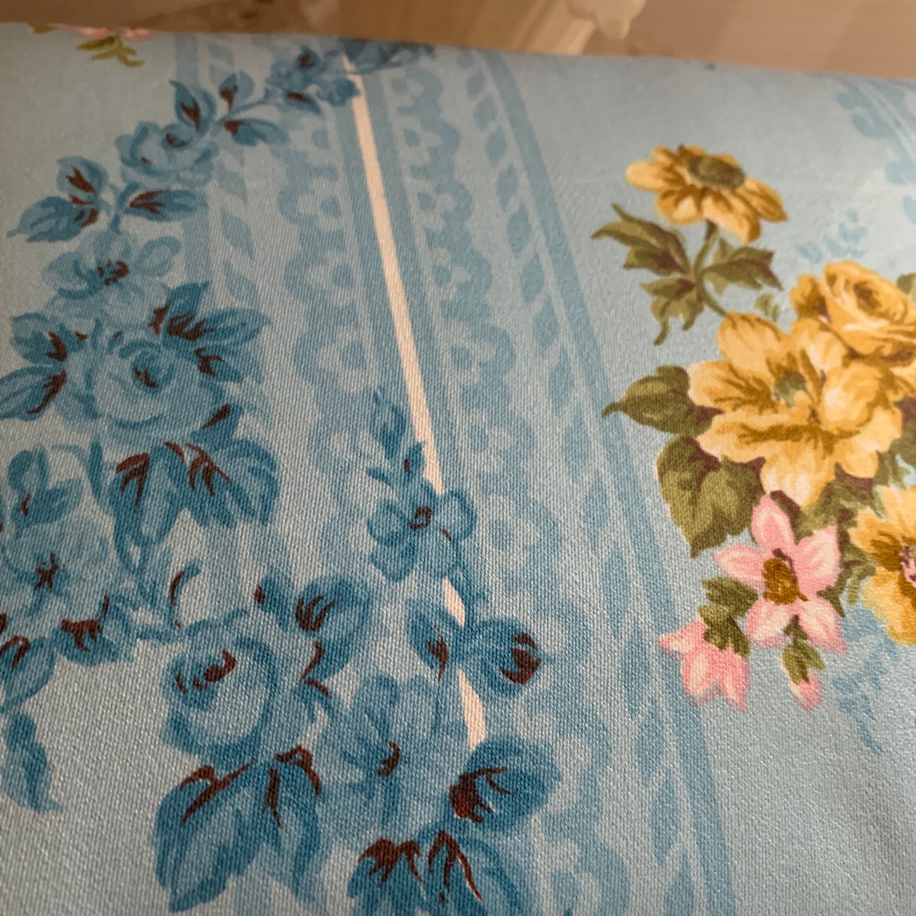 ゴールドローズとブルーローズが咲き誇る美しいファブリックに、アンティーク調のゴールドブレードとタッセルをあしらいました。