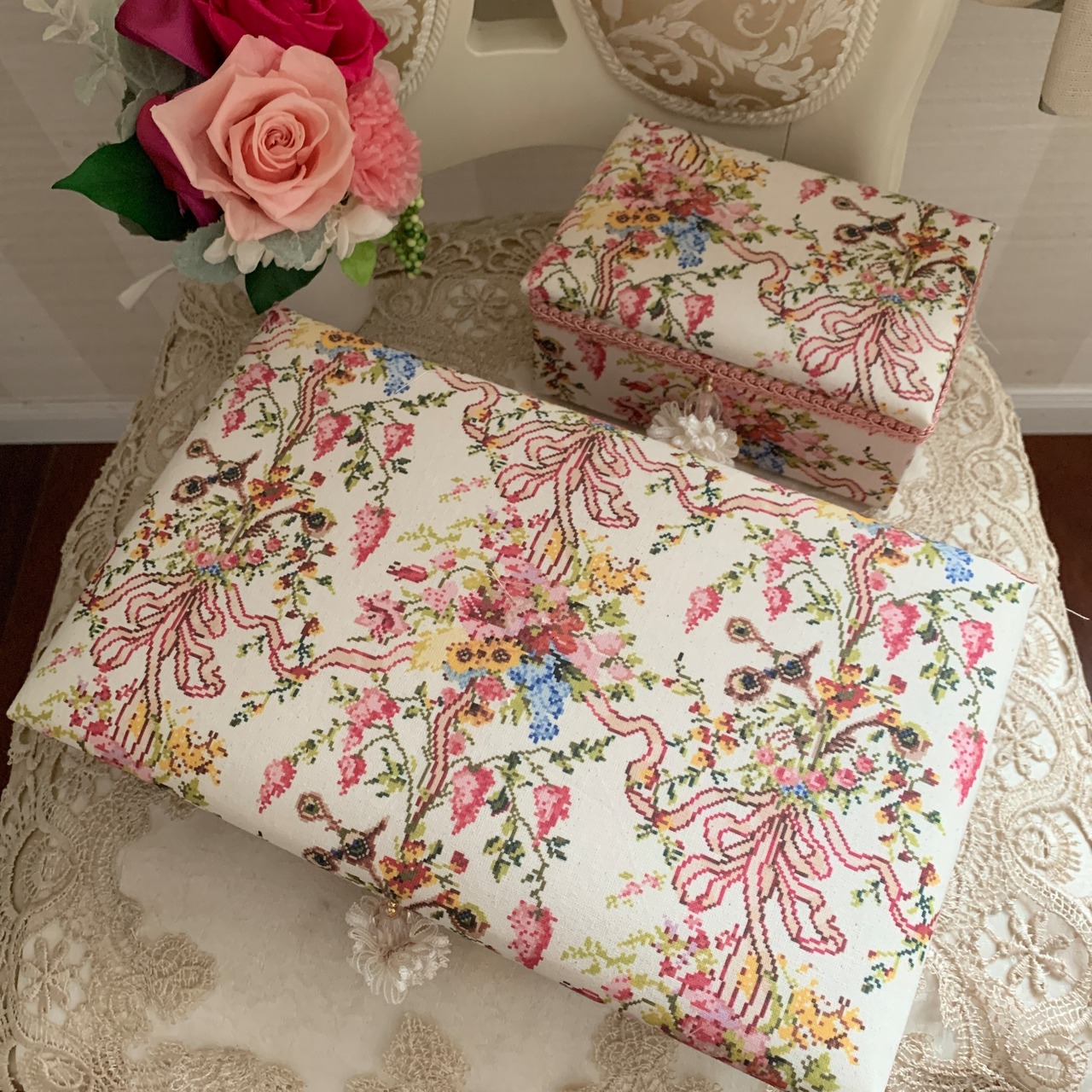 フランスから取り寄せたマリーアントワネットの王妃の寝室のお生地で小物入れボックスを作りました。