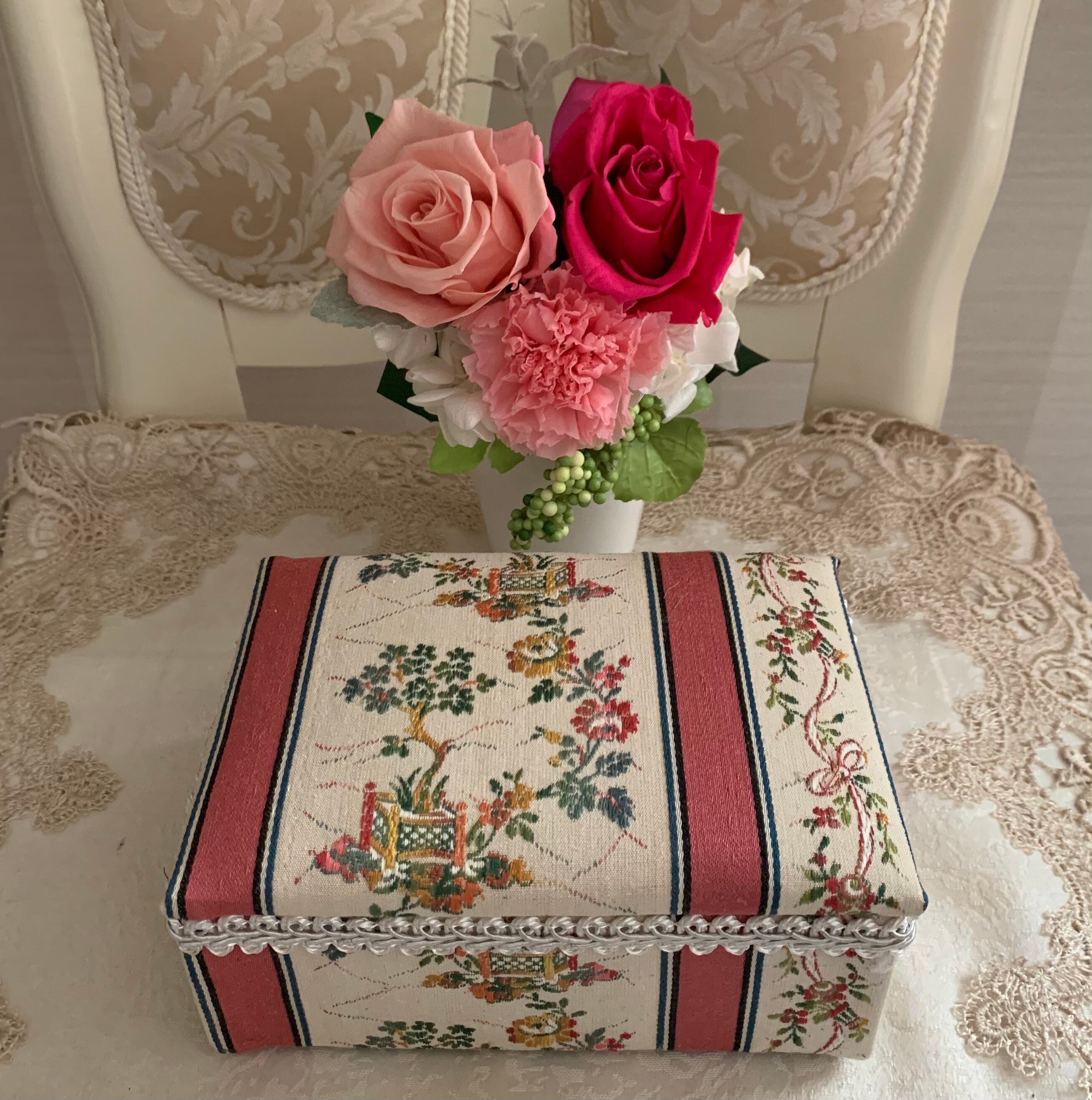 フランス産のアンティークファブリックでボックスを作りました。