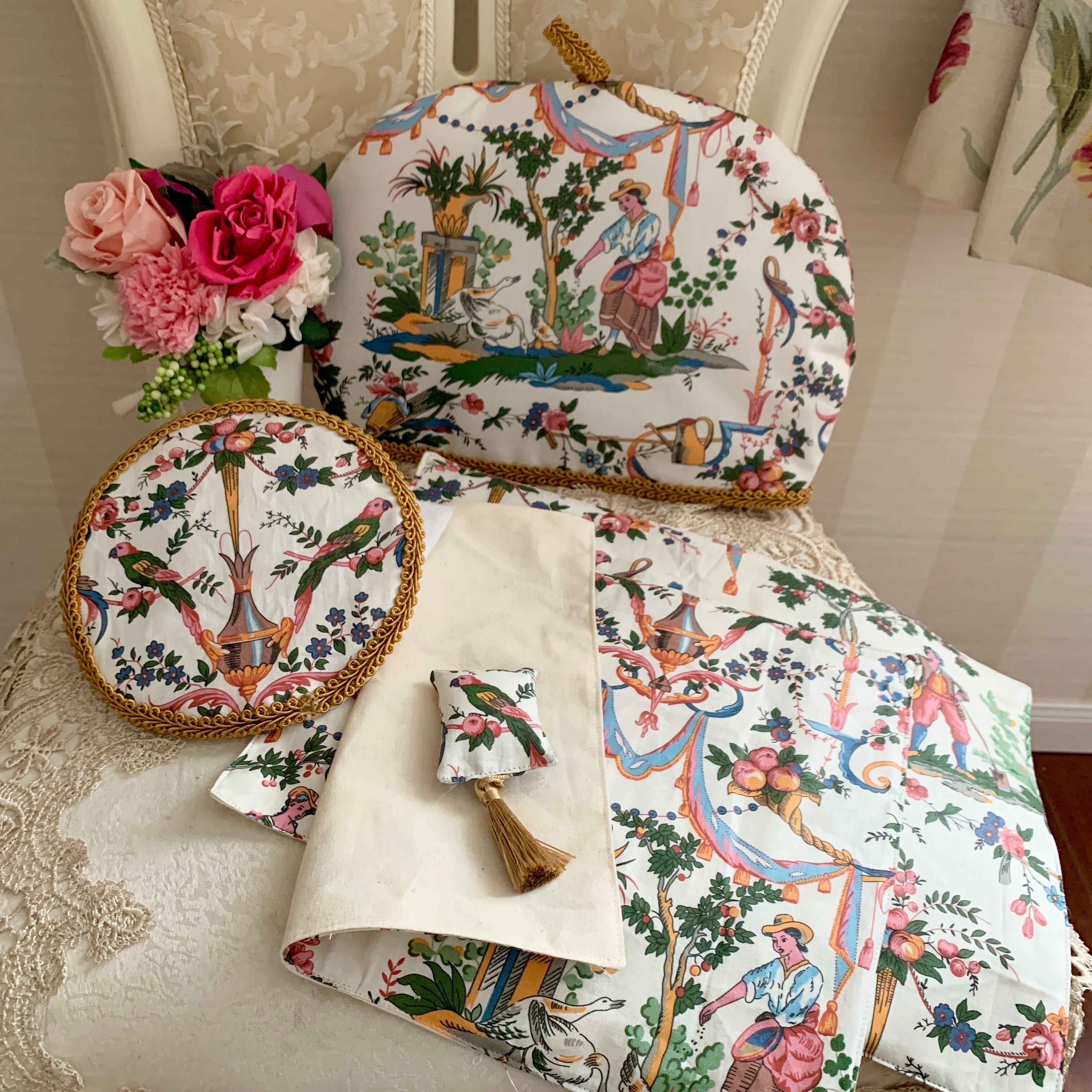 フランスから届いたトワルドジュイ【ヴァンセンヌの森】のファブリックで、ティータイム5点セットを作りました^^