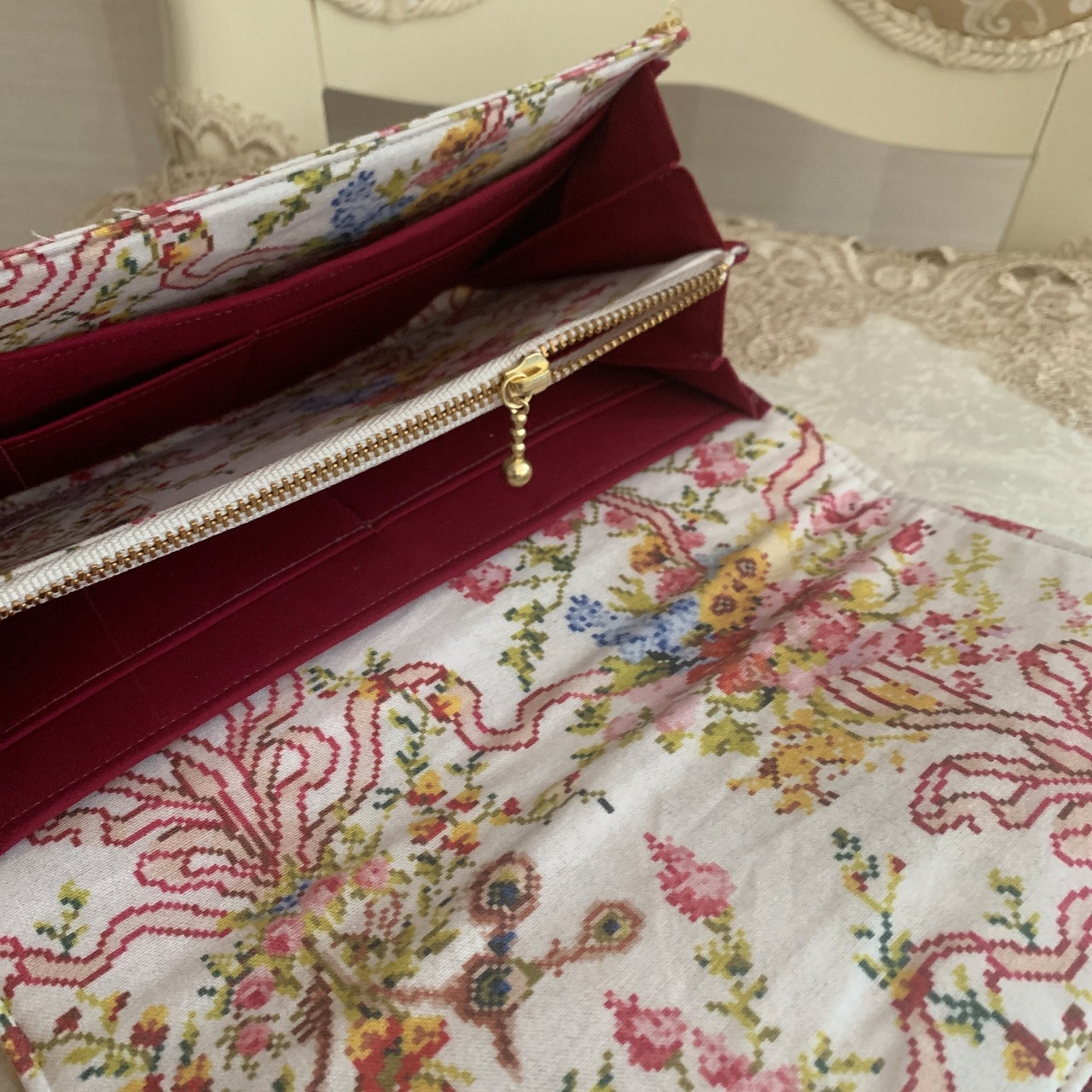 フランスから取り寄せたヴェルサイユ宮殿のマリーアントワネットの寝室の壁紙とカーテンの柄のお生地を使ってトートバッグ・お財布、ポーチのお得なセットを作りました。